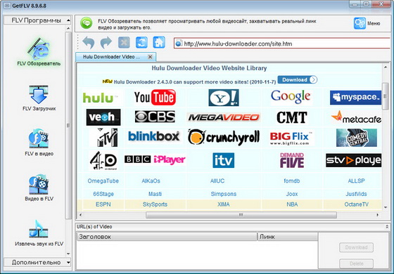 Hulu Downloader - представляет собой мощную утилиту для Windows, которая позволяет легко захватывать Flash фильмы, скачивать видео Hulu из Интернета, сохранять его на жестком диске, организовывать его, а также воспроизводить его, когда вы хотите, даже не будучи подключенным к Интернету. Hulu Downloader работает в фоновом режиме и скачивает фильмы быстро и безупречно. Программа также может загружать, конвертировать и играть Hulu видео и другие Flash Video (.FLV) файлы и является удобным инструментом для конвертации скачанных файлов FLV в различные популярные форматы: AVI, MPEG, MP4, 3GP, MOV, WMV и т.д.