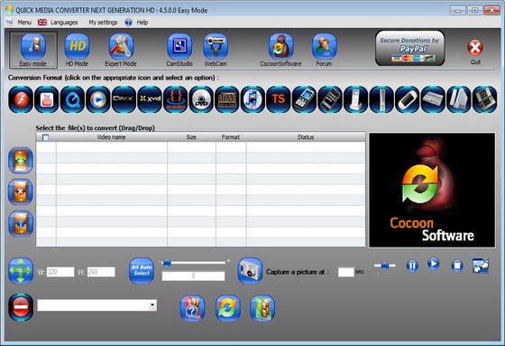 Quick Media Converter HD - бесплатная но мощная программа для конвертирования видео и аудио-файлов. Поддерживается преобразование всех наиболее популярных форматов. Программа содержит все необходимые кодеки и нет необходимости в их расширении. Поддерживает работу с веб-камерами и потоковым видео (запись с последующей конвертацией в требуемые форматы). В программу включены Multi Media Player и CamStudio. В данной версии добавлена поддержка конвертации видео файлов с Youtube, Daily Motion AVC, поддержка кодеков QCELP (США) аудио кодек и KDDI кодек (Япония), поддержка форматов TS HD спутниковых ресиверов Dreambox и других.