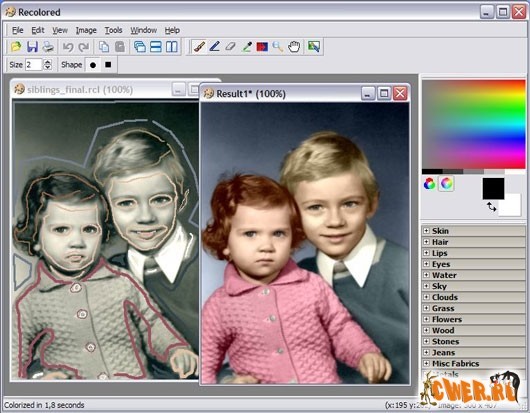 Программа Recolored предназначена для превращения черно-белой фотографии в цветную. Программа поражает своей простотой - выделите область, которую следует окрасить, затем укажите, каким должен быть ее цвет, а все остальное, включая распределение оттенков в зависимости от теней на выделенном обьекте, программа сделает сама. Получается довольно профессионально и естественно. Полученную картинку можно сохранить в формате JPEG, PNG, BMP или RCL.