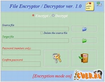 Программа позволяет кодировать и декодировать файлы любых форматов. Сама программа включает один файл и не требует инсталляции. Пароль нигде не сохраняется, что обеспечивает высокую степень защиты. Интерфейс [EnDe]coder красив и понятнен.