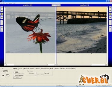 Программа, которая открывает два изображения и смешивает их различными способами - они могут быть равномерно наложены друг на друга, частично перекрываться, смешиваться различным образом, также можно применить несколько эффектов. Поддерживается большое количество операций отмены действия