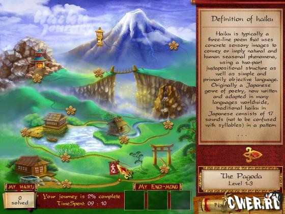 Эта игра дает вам уникальный шанс приобщиться к прекрасному миру поэзии. Вас ждет путешествие в Японию и знакомство со стихами хайку. Хайку (хокку) – это вид традиционной японской поэзии. Хайку называется трехстишие, построенное по принципу 5-7-5. Темой подобных стихотворений являются чувства и переживания автора в данный момент, соотношение человека с природой, кроме того, классическое хайку должно содержать так называемое «сезонное слово».