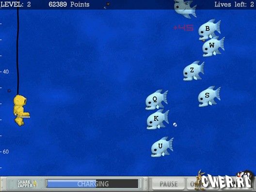 Эта игра очень отличается от остальных. Ее цель — познакомить с английской раскладкой клавиатуры и увеличить скорость набора. Водолаз погружается в пучины морей и океанов, наполненные акулами. На каждой акуле написано какое-то слово, и его нужно набрать до того, как они доберутся до нашей маленькой фигурки. Чем больше акульих атак мы отбиваем, тем глубже погружаемся. А акул все больше и больше, слова длиннее и длиннее...