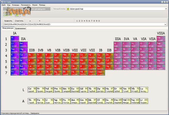 PL Table - это многофункциональная периодическая система элементов, лучшая реализация периодической системы на PC, позволяющая получать исчерпывающую информацию об элементах (более 20 типов данных о каждом химическом элементе), и встроенный химический калькулятор, позволяющий мгновенно уравнивать химические реакции любой сложности, решать химические задачи.