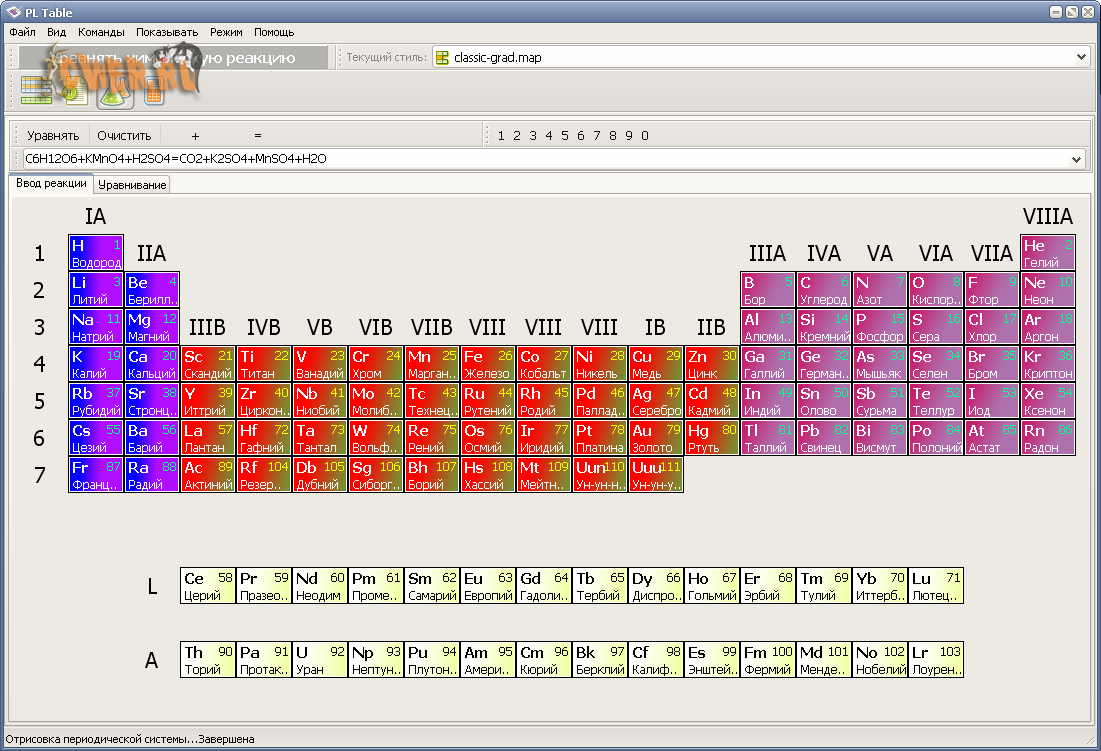 - Уравнивание химических реакций. В отличие от множества аналогичных программ, PL Table мгновенно уравнивает самые сложные реакции.