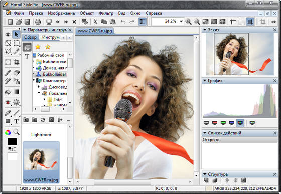 Hornil StylePix - программа, позволяющая ретушировать фотографии, изменять их размер, повернуть, провести цветокоррекцию, наложить текст, сделать фотоколлаж, вырезать, копировать и вставлять фотографии, применять различные фильтры, удалять эффект красных глаз и многое, многое другое. И это бесплатно. Имеет интуитивно понятный пользовательский интерфейс. Он предназначен для легкого и удобного управления отдельными функциями.
