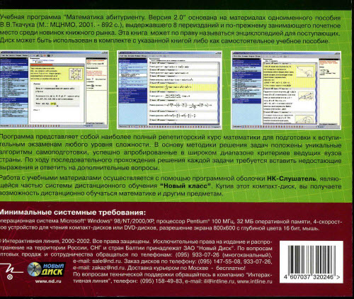 Проект "Математика - абитуриенту" основан на материалах одноименного пособия В.В.Ткачука (М., МЦНМО, 2001. - 892 с.) и включает более 1100 задач домашних заданий этого курса. Этот проект вместе с программной оболочкой НК-Слушатель может быть использован как самостоятельное учебное пособие либо в комплекте с указанной книгой.