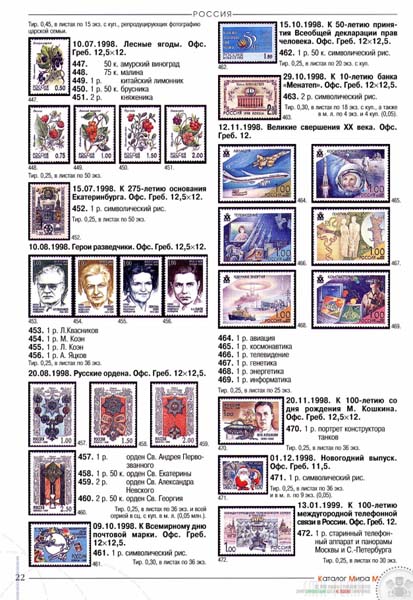 Иллюстрации цветные. Настоящий каталог включает все официальные, выпущенные почтовыми администрациями, знаки почтовой оплаты: марки, блоки, маркированные конверты и карточки со стандартными и с оригинальными марками России, стран Содружества Независимых Государств и Прибалтики, вышедшие с начала их эмиссионной деятельности до января 2002 года.