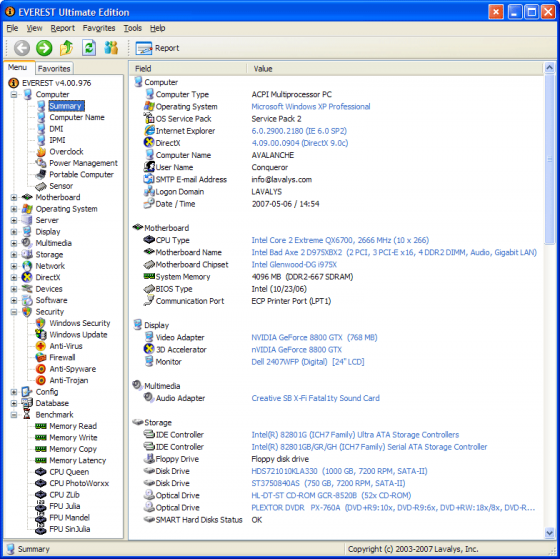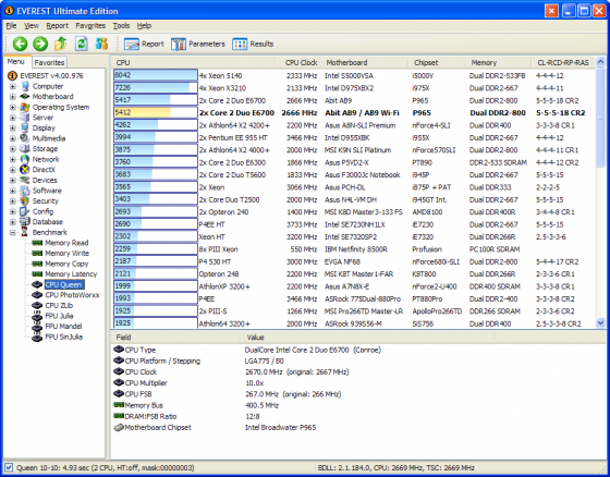 EVEREST CPUID panel to provide a compact overview on CPU, motherboard, RAM and chipset. Invaluable information on overclocked systems, dynamic refresh to support Enhanced Intel SpeedStep and AMD Cool'n'Quiet technologies.