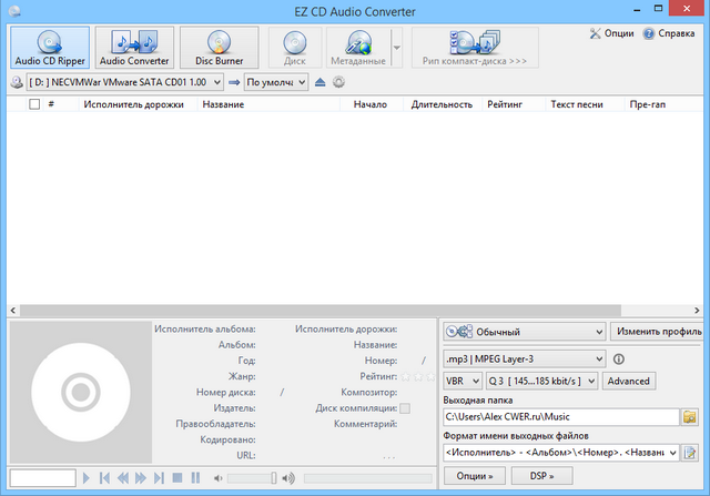 EZ CD Audio Converter - утилита для преобразования аудио-CD в качественные цифровые аудиофайлы, а также для записи MP3, WAV MP4, Windows Media Audio, FLAC, Ogg Vorbis, AAC и Monkey-s файлов на аудио-CD. Скачав приложение на cwer.ru, вы сможете преобразовывать аудиотреки непосредственно в MP3, WMA, VQF, OGG или WAV и конвертировать из одного аудиоформата в другой.