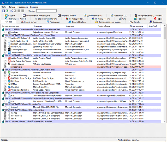 Просто запустите средство Autoruns, и оно покажет, какие приложения настроены на автоматический запуск, а также представит полный список разделов реестра и каталогов файловой системы, которые могут использоваться для задания автоматического запуска. Элементы, которые показывает программа Autoruns, принадлежат к нескольким категориям: объекты, автоматически запускаемые при входе в систему, дополнительные компоненты проводника, дополнительные компоненты Internet Explorer (включая объекты модулей поддержки обозревателя (BHO)), библиотеки DLL инициализации приложений, подмены элементов, объекты, исполняемые на ранних стадиях загрузки, библиотеки DLL уведомлений Winlogon, службы Windows и многоуровневые поставщики услуг Winsock. Чтобы просмотреть автоматически запускаемые объекты требуемой категории, достаточно выбрать нужную вкладку.