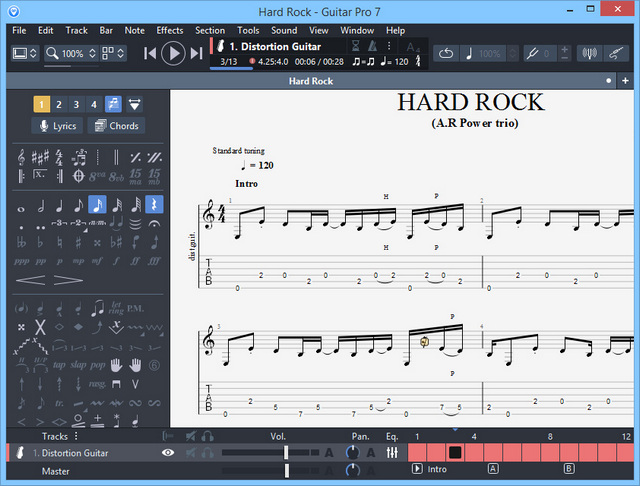 Guitar Pro - популярнейший табулатурный редактор от французских разработчиков! Настраиваемый режим отображения нот и табулатур с масштабированием, широкие возможности для печати и экспорта, расширенный набор приемов гитарной артикуляции и техник с более точной их имитацией, обозначения для лучшего нотного редактирования, и многое другое. Но самое главное! - совершенно новое звучание, предоставляемое собственной технологией RSE (Realistic Sound Engine) и встроенными программными процессорами эффектов. С установленным набором звуковых банков RSE, неискушенный слушатель не отличит звучания Guitar Pro от живых инструментов! На данный момент RSE включает в себя банки для семи разновидностей гитар, бас-гитары и ударных - имеется поддержка разнообразных эффектов, включая Wah-wah.
