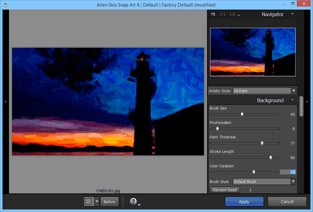 Alien Skin Snap Art - плагин для Adobe Photoshop, с помощью которого вы превратите свои фотографии в настоящие произведения искусства всего одним кликом мыши. Snap Art содержит достаточно большой набор предварительных заготовок, которые дают возможность трансформировать фото в картины, нарисованные маслом, углем, акварелью, цветными карандашами, ручкой и чернилами, пастельными мелками, а также в стиле комиксов, пуантилизма и импасто.