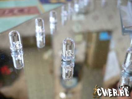 Диоды можно взять любого цвета свечения, но они должны быть супер яркими. Их надо вставить со стороны зеркала и зафиксировать термоклеем из пистолета.