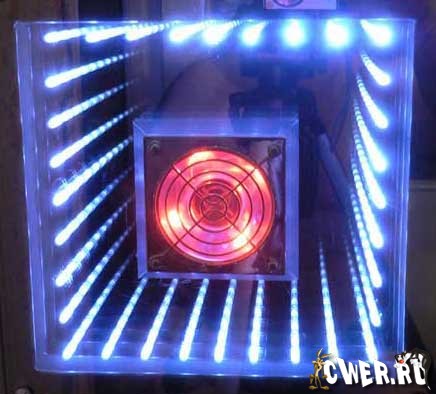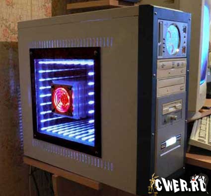Идеей этого моддинга было желание сделать эффект зрительно пустого корпуса, некой иллюзии бесконечной пустоты. Конструкция состоит из двух параллельно расположенных зеркал, одно из которых полупрозрачное, как в резонаторе лазера. Если между этими зеркалами поместить источник света, то создаётся очень красивый эффект уходящего в даль тоннеля с подсветкой. Что и было сделано – между стёклами было установлено 36 сверхъярких светодиодов и вентилятор с подсветкой для красоты и охлаждения корпусного пространства.