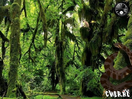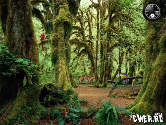 Тропический лес со своими обитателями поражает своей реалистичностью на фоне натуральных звуков живой природы.