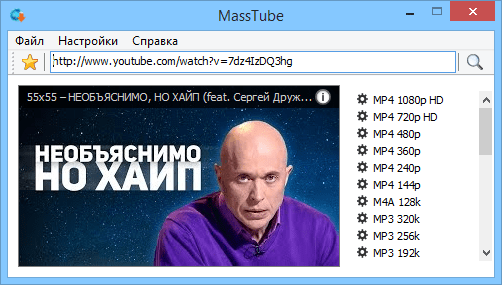 MassTube Plus — замечательная и простая в использовании утилита для быстрого и легкого скачивания видео с YouTube за пару кликов. Достаточно в строку поиска вставить ссылку на интересующий Вас видеоролик и нажать поиск, после чего программа предоставит список форматов и разрешений, в которых можно быстро скачать данный клип.