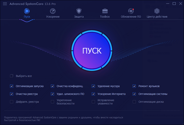 Advanced SystemCare - программный пакет, содержащий множество модулей для оптимизации, настройки и повышения производительности компьютеров, на базе ОС Windows 2000/XP/Vista/7/8/10. Приложение позволяет очистить компьютер от шпионского и рекламного ПО, найти и ликвидировать возможные угрозы и бреши в системе безопасности ОС, исправить ошибки в системном реестре, очистить временные и ненужные файлы, управлять списками автозагрузок, оптимизировать работу ПК.