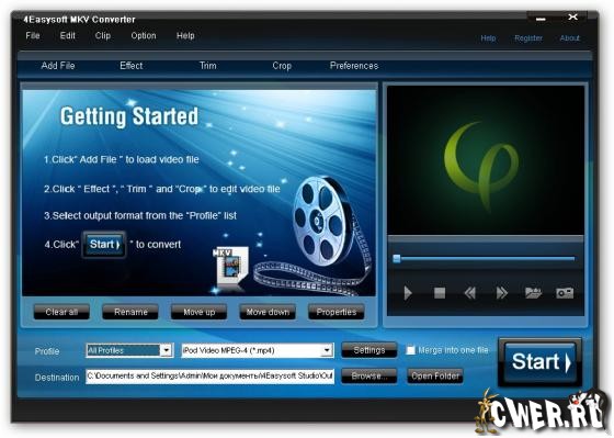 4Easysoft MKV Converter является весьма полезным программным обеспечением для преобразования MKV файлов в MP4, AVI, 3GP, FLV, DivX, MP3, M4A, WMA и т.д. 4Easysoft MKV Converter предназначен для преобразования MKV файлов в видео и аудио фоматы, поддерживаемые как большинством известных плейеров, так и устройствами IPod, iPhone, PSP, Archos, BlackBerry. Таким образом, вы можете преобразовать MKV файлы для YouTube, Quicktime и др.