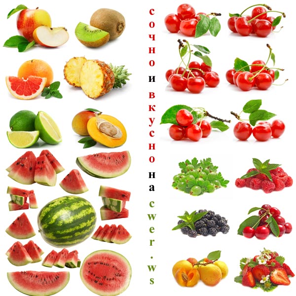 Профессиональный растровый клипарт, который представляет собой коллажи овощей, фруктов и ягод на белом фоне. Высококачественные и яркие композиции помогут создать вам креативный шедевр в вашей дизайнерской и творческой работе. Арбузы, виноград, персики, яблоки, ежевика, земляника, клубника, смородина, груша, крыжовник, алыча, вишня, черешня и множество других профессиональных фотографий собрано в архиве для вас на сайте cwer.ws