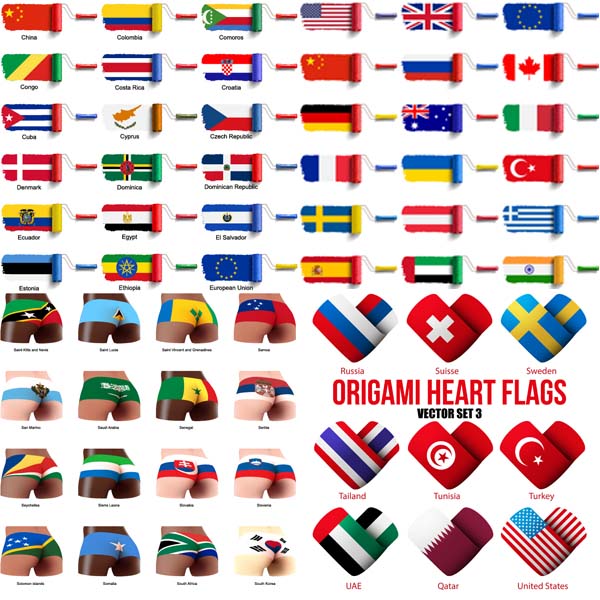 Замечательные векторные изображения в креативном исполнении, на которых представлены флаги стран мира. Клипарт представляет собой 25 файлов в формате EPS и превью в растровом формате для каждого файла.
