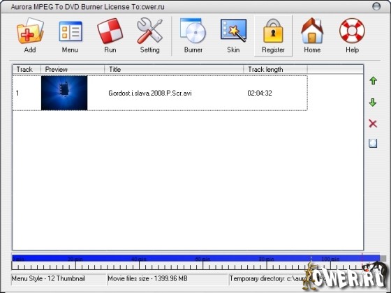 Aurora MPEG To DVD Burner - предназначена для записи MPEG файлов на DVD-R, DVD+R, DVD+RW, DVD-RW, VCD-R диски, для последующего просмотра на DVD-плеере. Кроме того, программа позволяет создавать структуру DVD диска, меню, с выбором всех настроек (меню, цвет, фон, шрифт и т.д.), копировать DVD или его структуру в ISO образ.