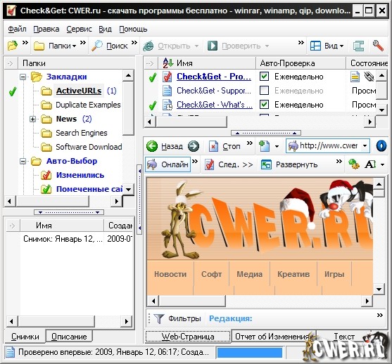 В наше время, информация – ключ к успеху. Более 80% всей существующей в мире информации доступно через сеть Интернет. Check&Get это известный в мире Интернет-Органайзер и система Веб-мониторинга на предмет подновления содержимого интересуемых страниц. Проверяет веб-страницы на изменения, извлекает и подсвечивает новую информацию.