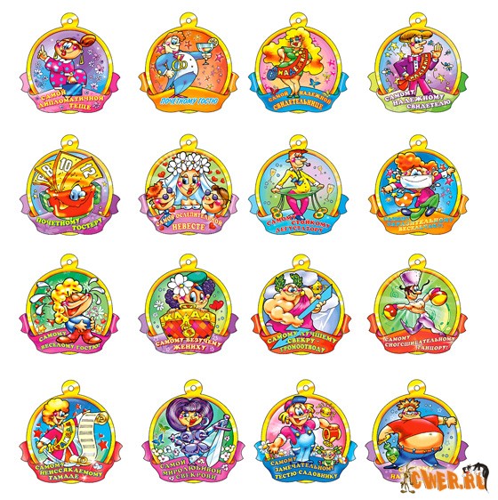 В архиве вы найдете 18 шутливых медалей для награждения гостей на свадьбе и 8 шутливых телеграмм. Эскизы выполнены в формате JPG, с разрешением 300 dpi. Распечатай и вырежи