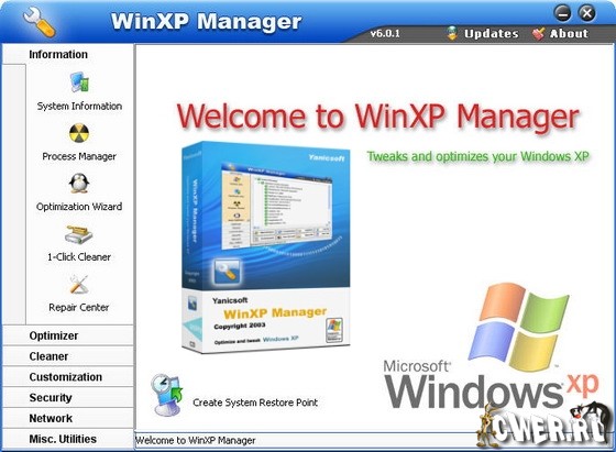 WinXP Manager - программа для настройки и оптимизации операционной системы. Содержит около трех десятков разнообразных утилит, которые позволяют получить доступ к нескольким сотням скрытых опций для настройки операционной системы. С ее помощью можно попытаться улучшить быстродействие Windows, улучшить настройки безопасности, произвести очистку реестра, удалить мусорные файлы, ускорить передачу данных по сети и через Интернет. Кроме этого, программа дает возможность создать резервную копию данных для почтового клиента Outlook Express, автоматически проверить неработающие ссылки в "Избранном" и прочее. Для неопытных пользователей программа предлагает удобный мастер настройки.