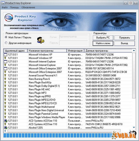 После запуска программы достаточно будет нажать Find Keys и она сама просканирует реестр, и выдаст список программ, установленных на компьютере и регистрационные данные к нем. В программе есть окно для авторизации Администратора, если установлены ограничения на уровне пользователей. Может работать по сети с другими компьютерами и по заданному диапазону IP адресов или по списку IP в текстовом документе.