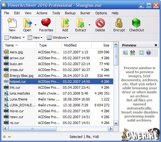 Вышла первая бета-версия многофункционального архиватора PowerArchiver 2010. Программа может выполнять практически все операции, необходимые при работе с архивами (создание, просмотр, извлечение файлов; добавление файлов; создание самораспаковывающихся и многотомных архивов; шифрование методами Blowfish 128-bit, DES 64-bit, Triple DES 128-bit и AES 128-bit; восстановление повреждённых зип-архивов и т.д.).