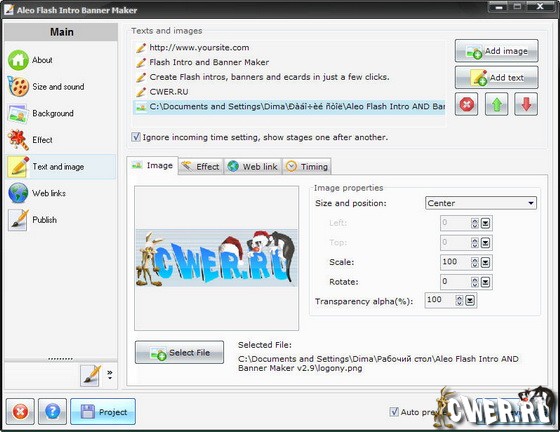 Простой и чрезвычайно удобный пользовательский интерфейс программы Flash Intro and Banner Maker, в стиле мастера, поможет вам создать различные по красоте и креативности баннеры всего несколькими щелчками мыши без какого либо знания основ Flash и его Actionscriptов. Имеет множество фоновых и текстовых эффектов, которые настраиваемы, включая предложения, шрифты, связанные интернет ссылки на ресурсы, раскраска, звуки и т.д.