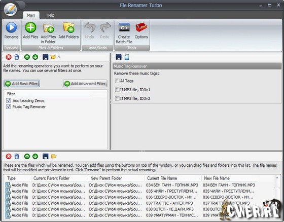 Kristanix File Renamer Turbo это новейший инструмент, который значительно облегчит вашу жизнь! Если вам нужно переименовать несколько файлов или заполнить ID3 тэги к MP3 файлам и музыкальные тэги к WMA, M4A, OGG, FLAC, APE или MPC файлам, эта программа сделают всю работу за пару минут. Kristanix File Renamer Turbo очень прост в использовании и обладает всей функциональностью, которая вам будет нужна. Дополнительные возможности программы: возможность перемещать файлы, поддержка regex, поддержка работы с командной строкой, поиск музыки в Интернете и расширение оболочки Windows по правому клику.