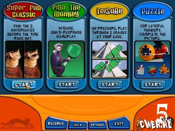 Продолжение 5 Spots II порадует игроков тремя новыми режимами, помимо классического: Find the Monkey (найти на представленной картинке 5 обезьян в различных вариациях), Leisure (игра без временных рамок), Puzzle (из данной картинки вырезаются 5 кусочков-квадратов, а потом из дюжины таких же геометрических фигур требуется выбрать подходящие вам).