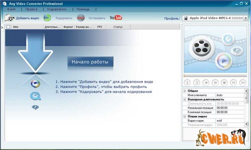 Программа для конвертирования видео файлов. Any Video Converter Free позволяет перекодировать популярные видео форматы (AVI, MOV, RM, MPEG, DVD, WMV, MP4 и FLV) в DVD, VCD, MP4 или FLV.