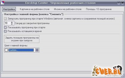 Программа предназначена для автоматической смены картинки рабочего стола, а также автоматического сохранения позиций иконок на рабочем столе. После автоматического запуска и смены картинки программа закрывается. Помимо автоматических действий в программе предусмотрена возможность ручной смены картинки и ручного сохранения/восстановления позиций иконок на рабочем столе.