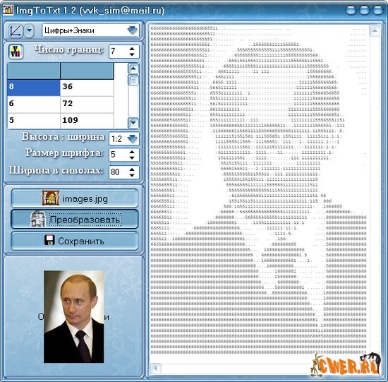 Программа преобразовывает картинку в текстовый документ, состоящий из символов так что при рассмотрении вы увидите вашу картинку.В программе можно самостоятельно настраивать символы и границы их подстановки, количество символов в строке, размер шрифта. Автоматическое разбиение на символы по разным шаблонам.Возможность сохранить в многостраничный файл, с заданием числа символов в строке и строк на странице.