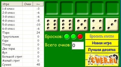 В игре каждый игрок делает 15 ходов. Нужно закрыть школу от 1 до 6 разряда (выкинуть за ход в 3 броска - 3 одинаковые комбинации). И закрыть покерные комбинации - с первой руки выпавшая комбинация удваивается на 2.