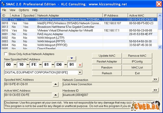 Утилита для изменения MAC-адреса сетевой карты в операционной системе Windows. SMAC поддерживает работу практически со всеми современными сетевыми картами.