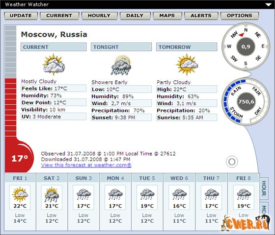 Weather Watcher - отличная программа, позволяющая получать сводку погоды в выбранном регионе для любого города по всему миру. Можно смотреть данные о погоде как по дням недели, так и по часам. Weather Watcher - небольшая настольная погодная станция, которая спокойно "сидит" в системном трее и автоматически обновляет сведения о погоде в указанном интервале времени.