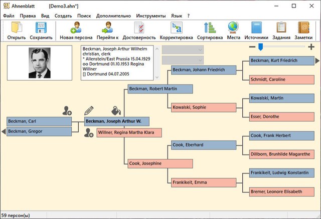 Ahnenblatt - это простая в использовании полнофункциональная программа для генеалогии, подходящая как для начинающих, так и для опытных специалистов по генеалогии, которые могут организовать свое генеалогическое исследование. Используйте проверку достоверности, чтобы находить неточности в своей семье и создавать впечатляющие диаграммы всего несколькими щелчками мыши.