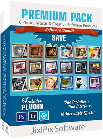 Для максимальной экономии и удобства JixiPix Premium Pack объединяет 18 невероятных креативных приложений в один мощный пакет: Aquarella, Artista Haiku, Artista Oil, Artista Sketch, Artoon, Chalkspiration, Dramatic Black&White, Grungetastic, Kyoobik Photo, Moku Hanga, NIR Color, Pop Dot Comics, Portrait Painter, Rainy Daze, Romantic Photo, Simply HDR, Snow Daze and Vintage Scene. Пакет Premium Pack работает как автономное приложение или как плагин в Photoshop, Elements, Lightroom и PaintShop Pro.