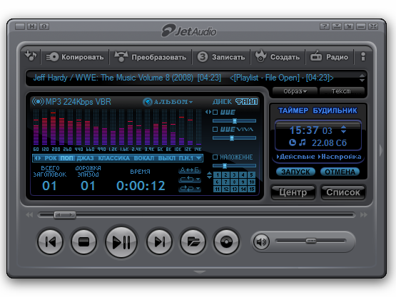 jetAudio является, пожалуй, самым навороченным и мощным из мультимедийных центров - целая аудио/видеосистема. Умеет проигрывать MP3, MP2, WAV, MID, REAL AUDIO/VIDEO, S3M, MOD, MPG, AVI, MOV, Video/Audio CD, RealPlayer G2 и некоторые другие форматы мультимедийных файлов. jetAudio способен применять встроенные 3D-звуковые фильтры к любому аудиоисточнику (есть фиксированные настройки Room, Hall, Stage, Stadium), кроме этого, у программы имеются многополосный эквалайзер и регуляторы Reverb и 3D, позволяющие добиться наилучшего качества звука.