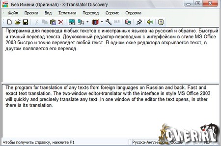 Программа для перевода любых текстов с иностранных языков на русский и обратно. Быстрый и точный перевод текста. Двухоконный редактор-переводчик с интерфейсом в стиле MS Office 2003 быстро и точно переведет любой текст. В одном окне редактора открывается текст, в другом появляется его перевод.