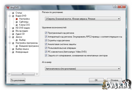 AnyDVD HD - программа для дешифрования CSS и снятия региональной защиты с любого DVD диска в любом DVD-ROM устройстве. Как насчет немедленного просмотра DVD видео на компьютере c DVD-ROM, региональный код которого не соответствует этому DVD диску, не переписывая его на жесткий диск целый час, используя специальные дешифрующие утилиты? AnyDVD обнаружит это несоответствие и автоматически снимет защиту. Это займет лишь пару секунд. Даже если ваш DVD-ROM не обеззонен, у вас есть возможность просматривать диски с любым региональным кодом.