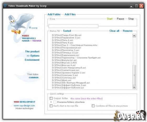 Специально для этих целей была создана небольшая утилита под названием Video Thumbnails Maker. Она позволяет снимать кадры для предварительного просмотра практически с любых видеофайлов, для которых установлены совместимые декодеры. Утилита имеет широкий диапазон настроек. Поддерживается пакетное снятие, раскадровка, нанесение водяных знаков, обрезка углов кадров, применение рамок, теней, альфа-каналов, штамповку времени в кадрах, добавление информации о видео, настраивать прозрачность, цвета и шрифты служебной информации.