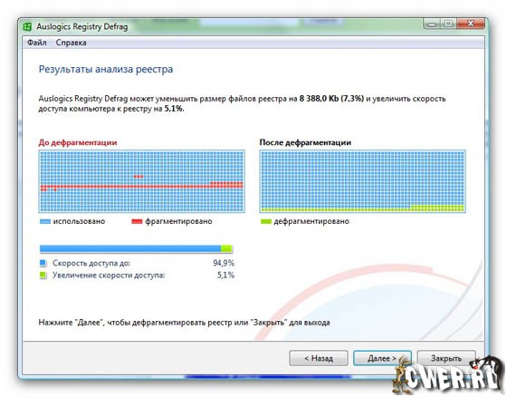 Загрузите Auslogics Registry Defrag, чтобы дефрагментировать и сжать ваш реестр. Программа проверит реестр на наличие ненужных данных, испорченных ключей и создаст копию реестра, которая будет меньше и не будет содержать ненужных данных.