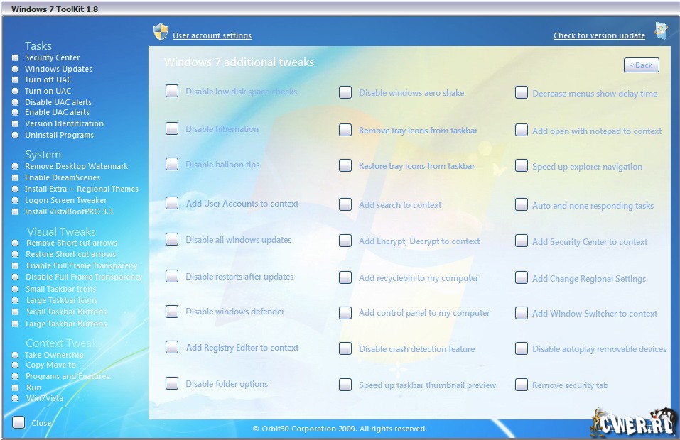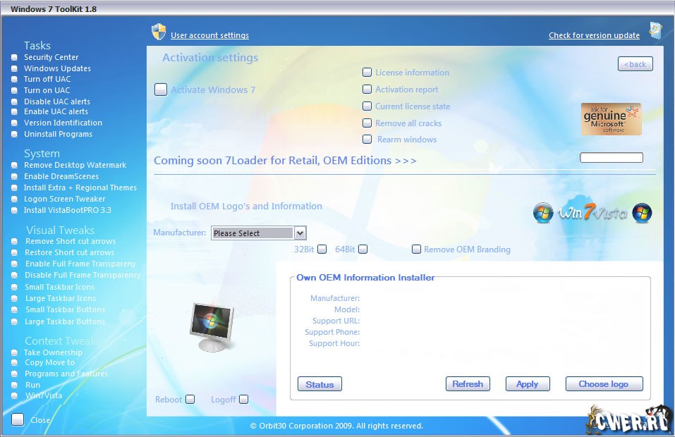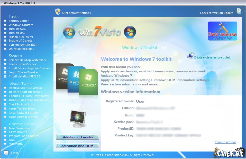 Оптимизатор системы Windows 7. Главная функция его - полная активация системы. Теперь версия системы не будет работать как RC, до определённого времени, а как полноценная многофункциональная система.