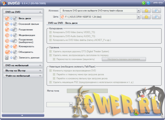 - Копировать на чистый DVD диск любого формата(DVD+R/RW, DVD-R/RW, DVD+R DL, DVD-R DL).