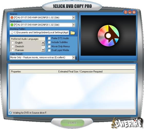 1Click DVD Copy - простой и быстрый инструмент для копирования видео DVD. Подойдёт как начинающим пользователям, (так как очень прост), так и продвинутым... Важно не то, что она обладает простым, но эргономичным интерфейсом и быстро работает, а то, что именно эта программа выдает наилучшее качество изображения при копировании среди себе подобных. Даже при 40% сжатии копия практически неотличима от оригинала.